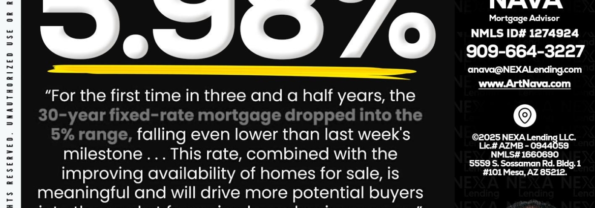 5.98% - Art Nava -Mortgage AdvisorHi, my name is Art Nava. I’m a Loan Officer with NEXA Lending LLC., offering personalized mortgage solutions, fast customized quotes, great rates and service with integrity.