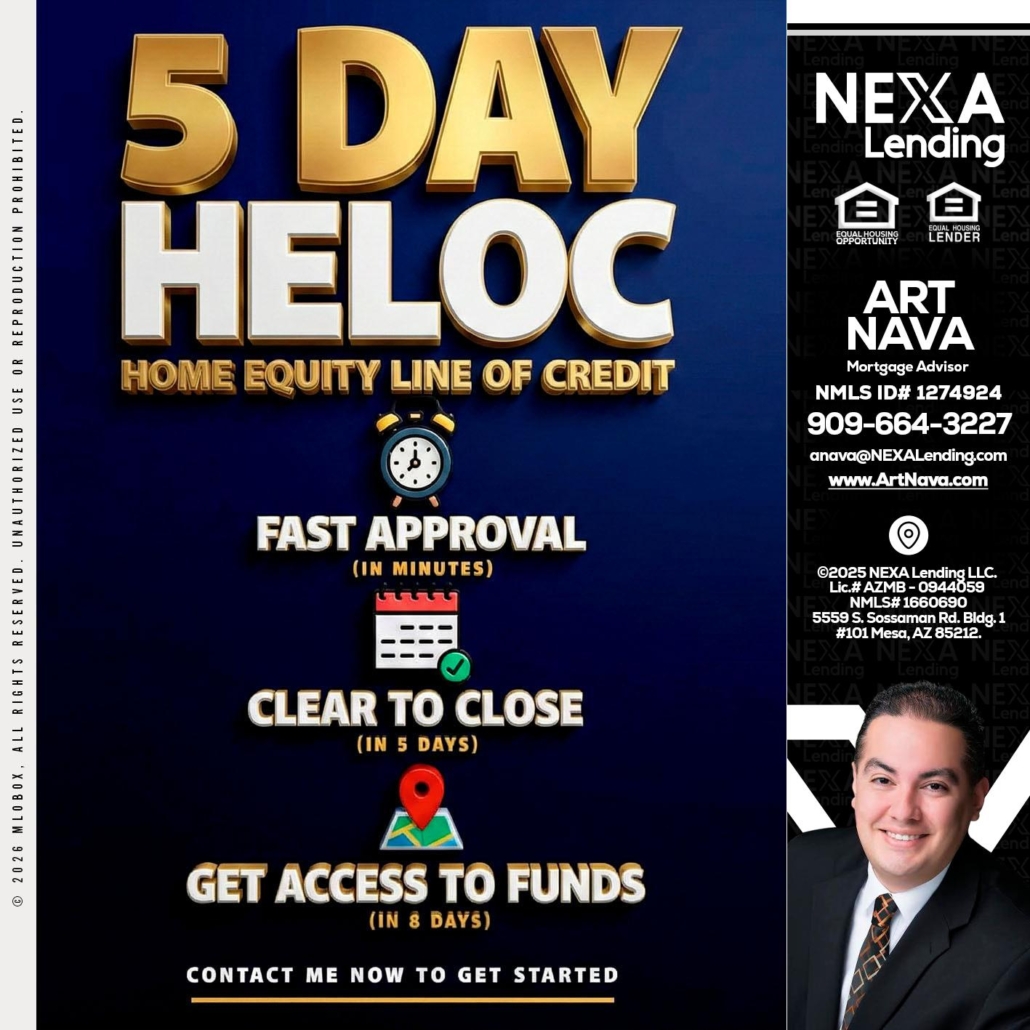 5 day hello - Art Nava -Mortgage AdvisorHi, my name is Art Nava. I’m a Loan Officer with NEXA Lending LLC., offering personalized mortgage solutions, fast customized quotes, great rates and service with integrity.