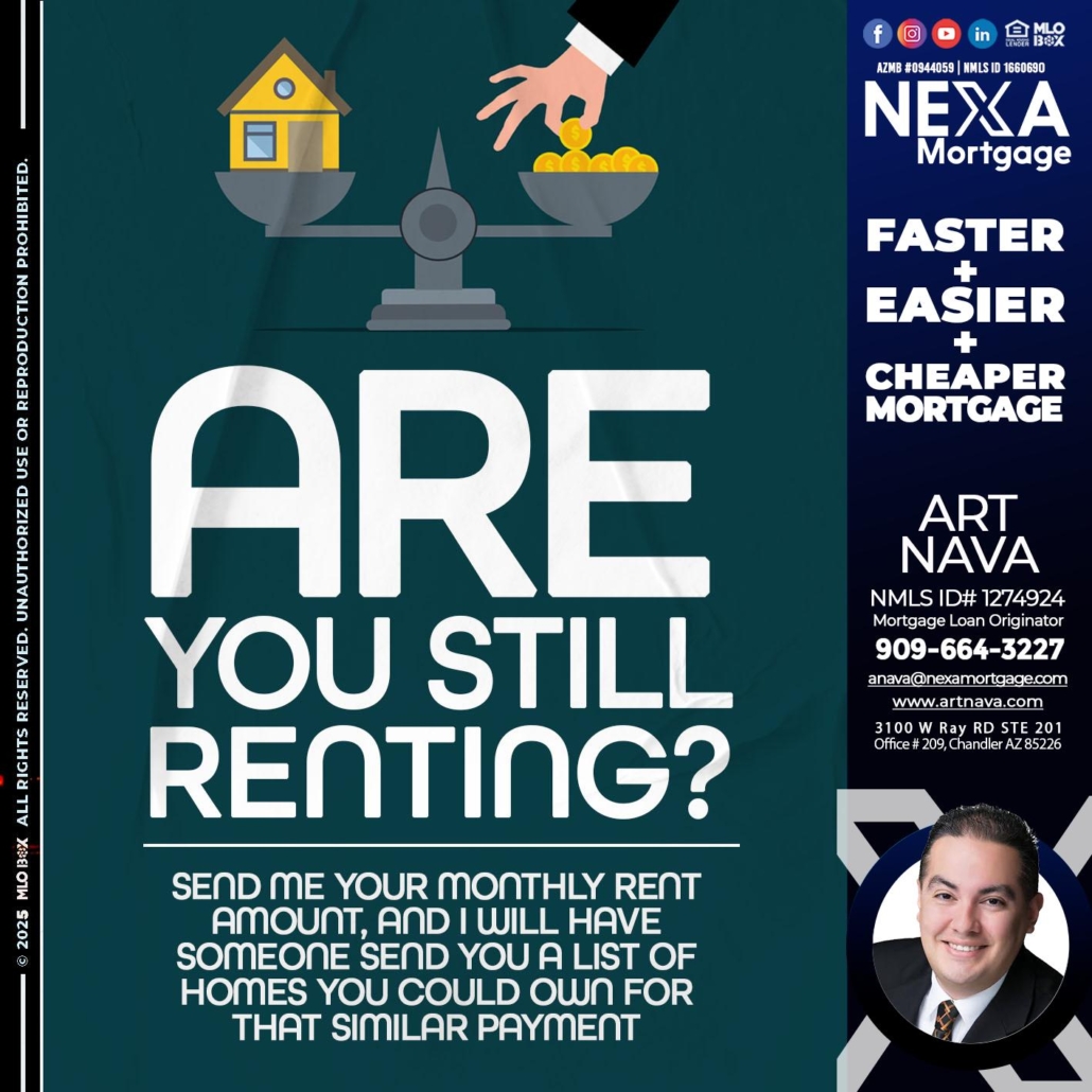 ARE YOU STILL RENTING? - Art Nava -Mortgage Loan OriginatorHi, my name is Art Nava. I’m a Loan Officer with NEXA Mortgage LLC., offering personalized mortgage solutions, fast customized quotes, great rates and service with integrity.