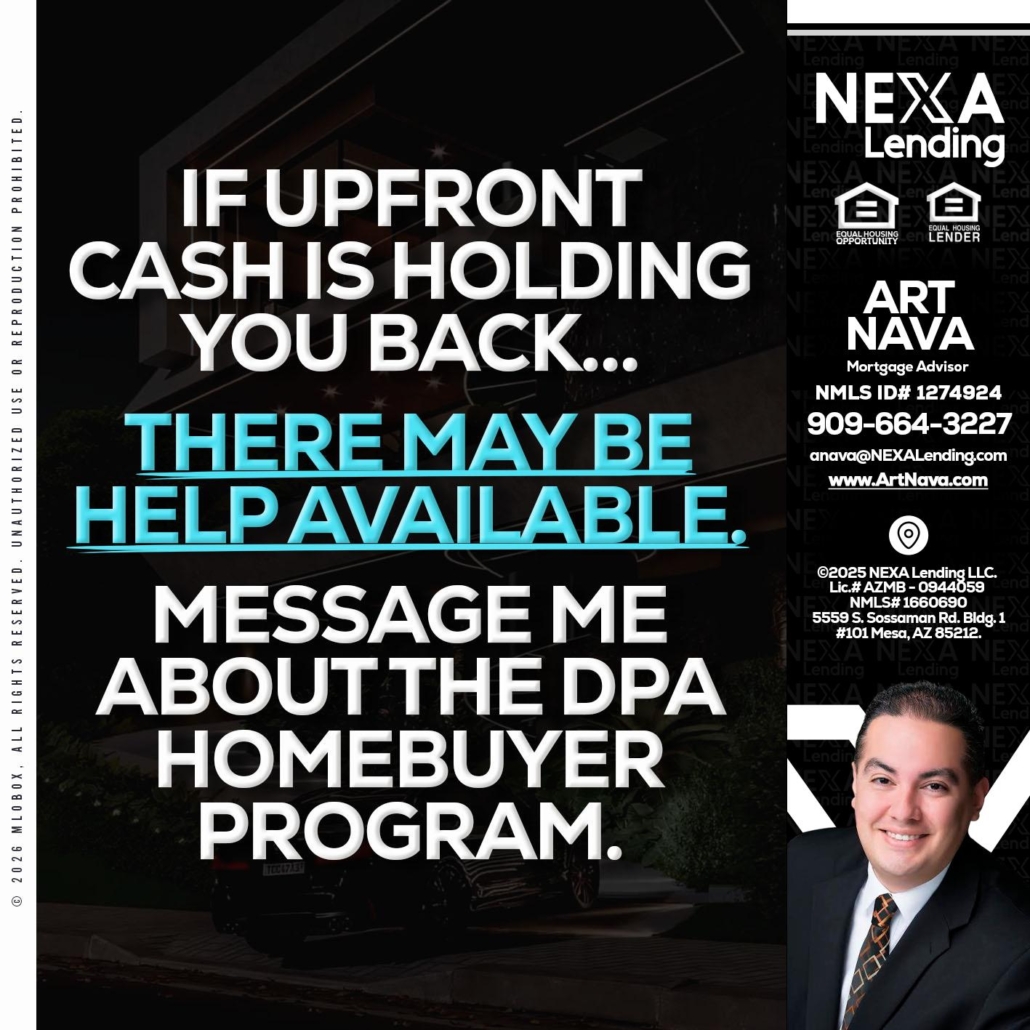 IF UPFRONT - Art Nava -Mortgage AdvisorHi, my name is Art Nava. I’m a Loan Officer with NEXA Lending LLC., offering personalized mortgage solutions, fast customized quotes, great rates and service with integrity.