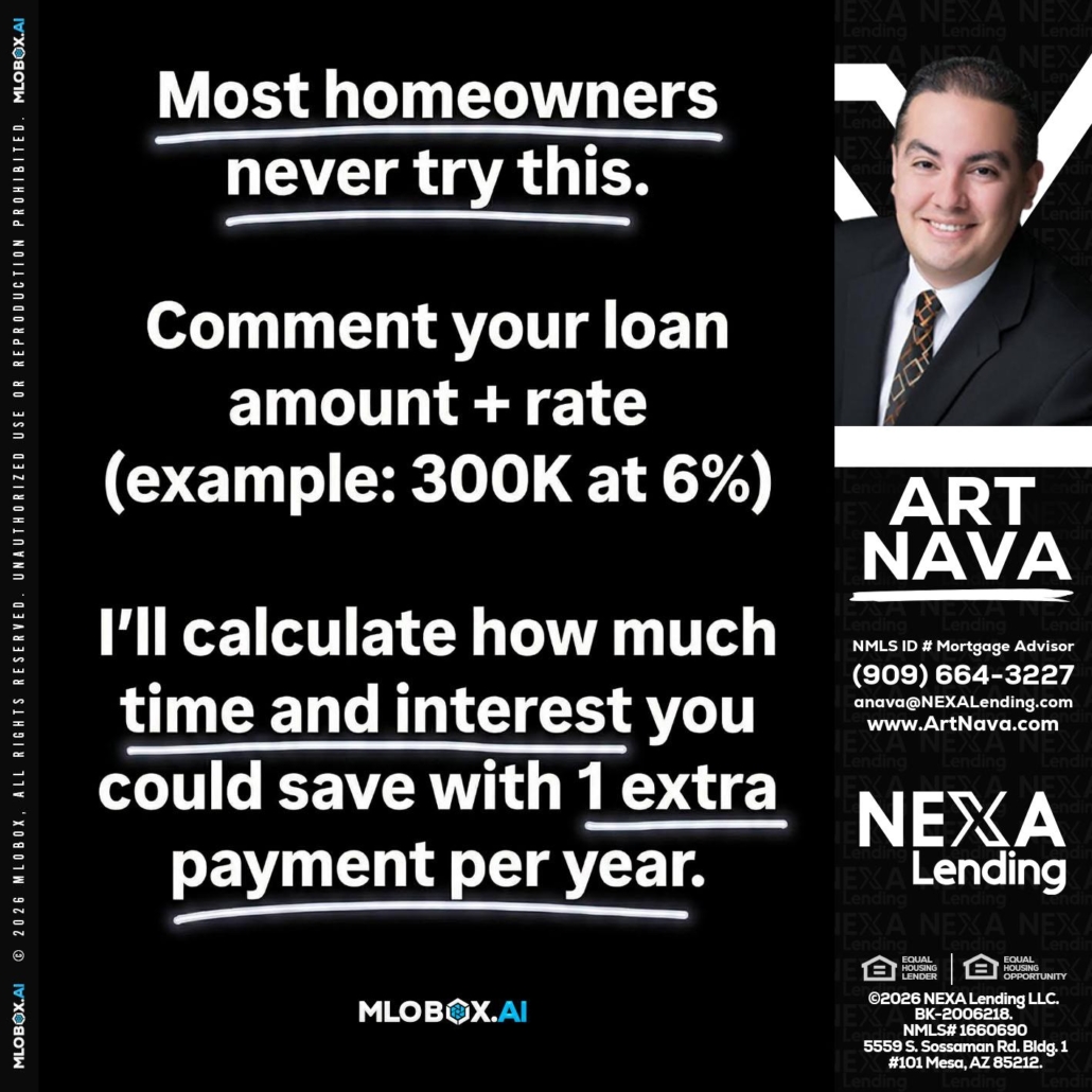 most owners - Art Nava -Mortgage AdvisorHi, my name is Art Nava. I’m a Loan Officer with NEXA Lending LLC., offering personalized mortgage solutions, fast customized quotes, great rates and service with integrity.