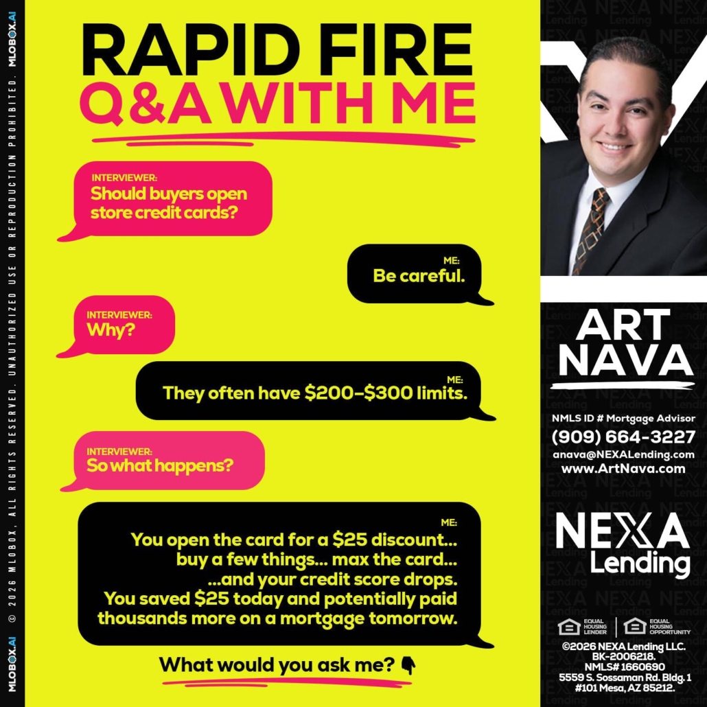RAPID FIRE Q&A - Art Nava -Mortgage AdvisorHi, my name is Art Nava. I’m a Loan Officer with NEXA Lending LLC., offering personalized mortgage solutions, fast customized quotes, great rates and service with integrity.