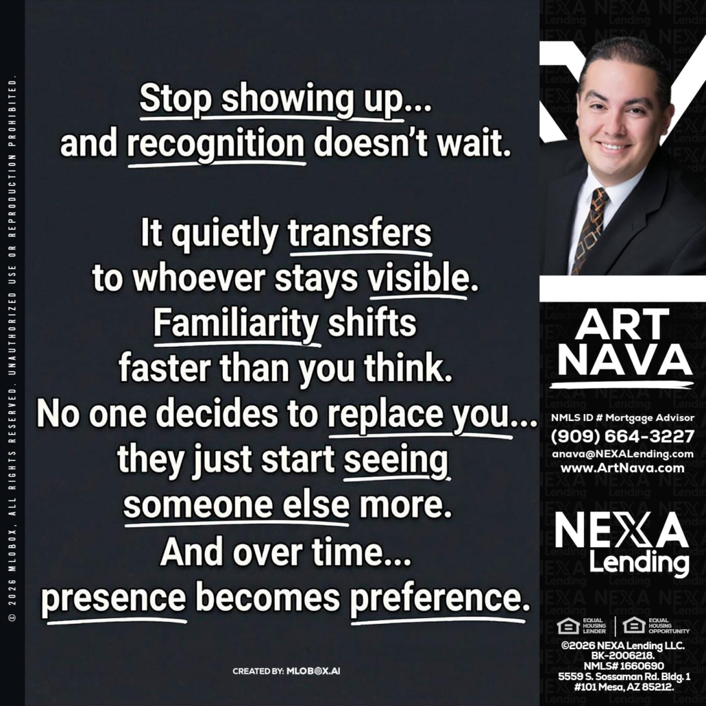 STOP SHOWING - Art Nava -Mortgage AdvisorHi, my name is Art Nava. I’m a Loan Officer with NEXA Lending LLC., offering personalized mortgage solutions, fast customized quotes, great rates and service with integrity.