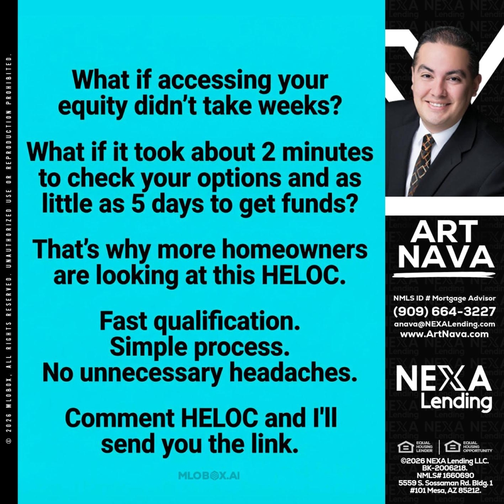 Hi, my name is Art Nava. I’m a Loan Officer with NEXA Lending LLC., offering personalized mortgage solutions, fast customized quotes, great rates and service with integrity.
